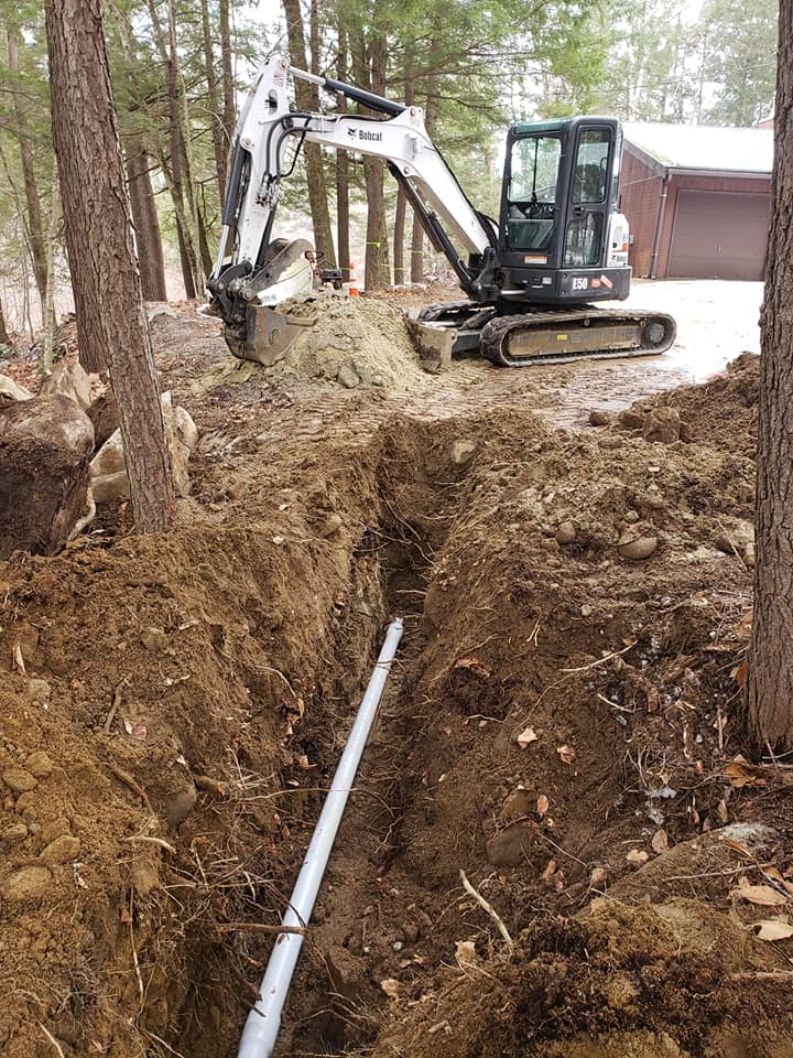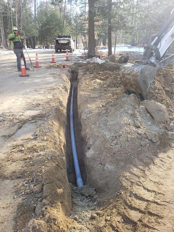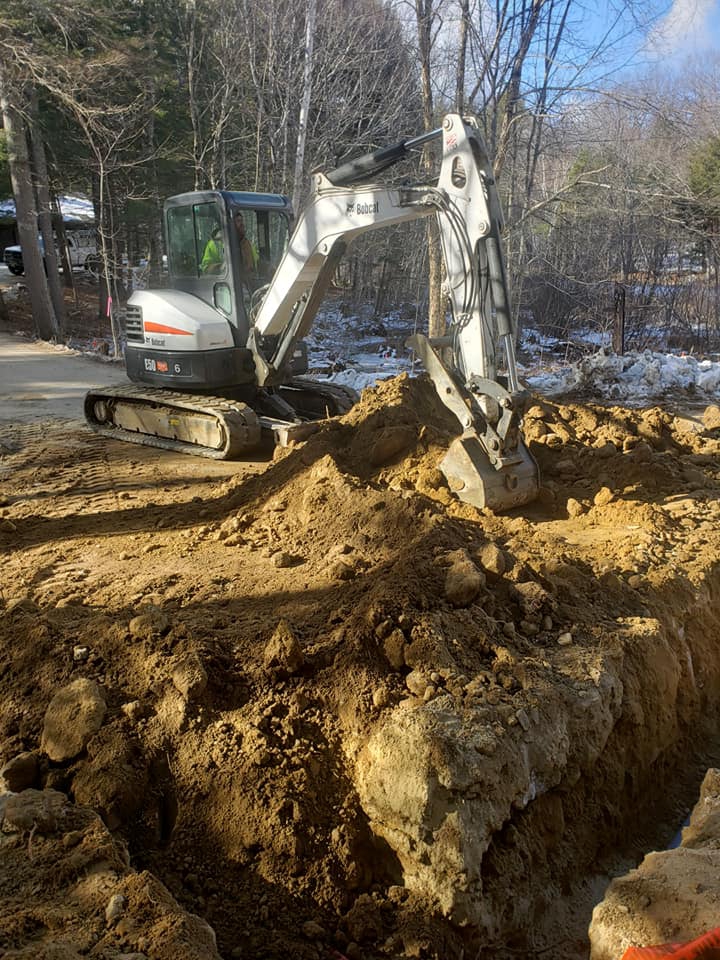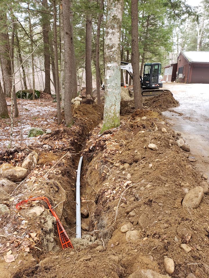 Before the every other day snow started, Tim, Kevin and Mike were up north on a commercial project in Moultonborough. They were tasked with excavating and installing 260′ of schedule 80 conduit from an electrical pullbox to the customer’s existing house meter. Although it had it’s challenges with all of the rocks and boulders that needed to find new homes, the guys did a real good job getting it done! They’ll be back after mud season for restoration.